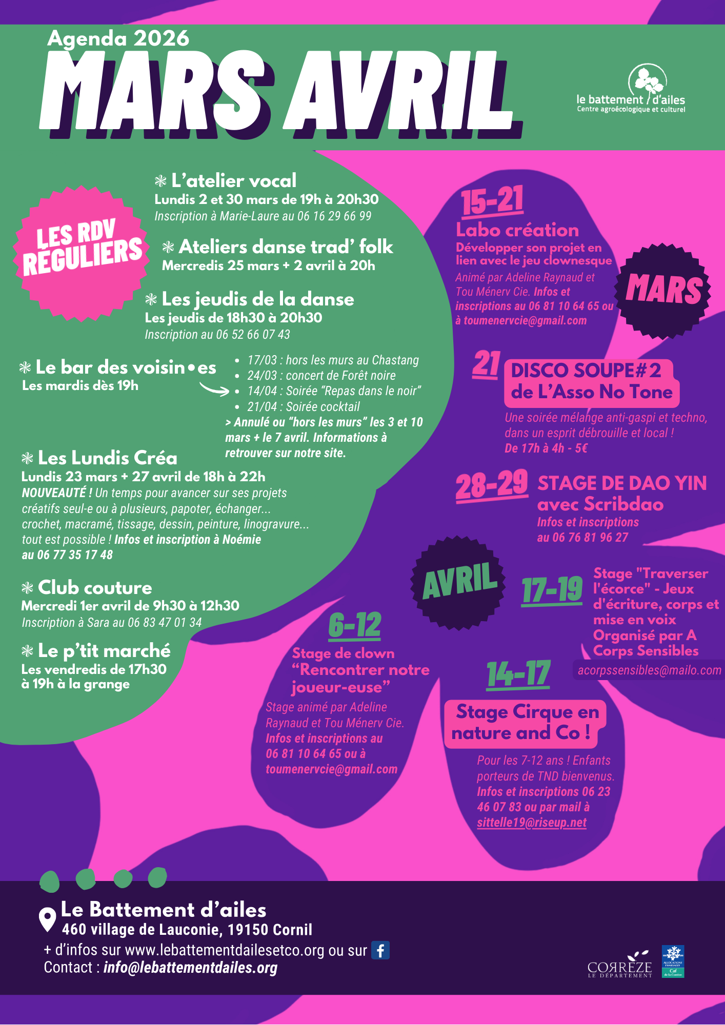 Voici l’agenda pour les 2 prochains mois, n’hésitez pas à le consulter et à même le télécharger et à l’imprimer pour le mettre sur votre frigo ! À bientôt sur la colline !